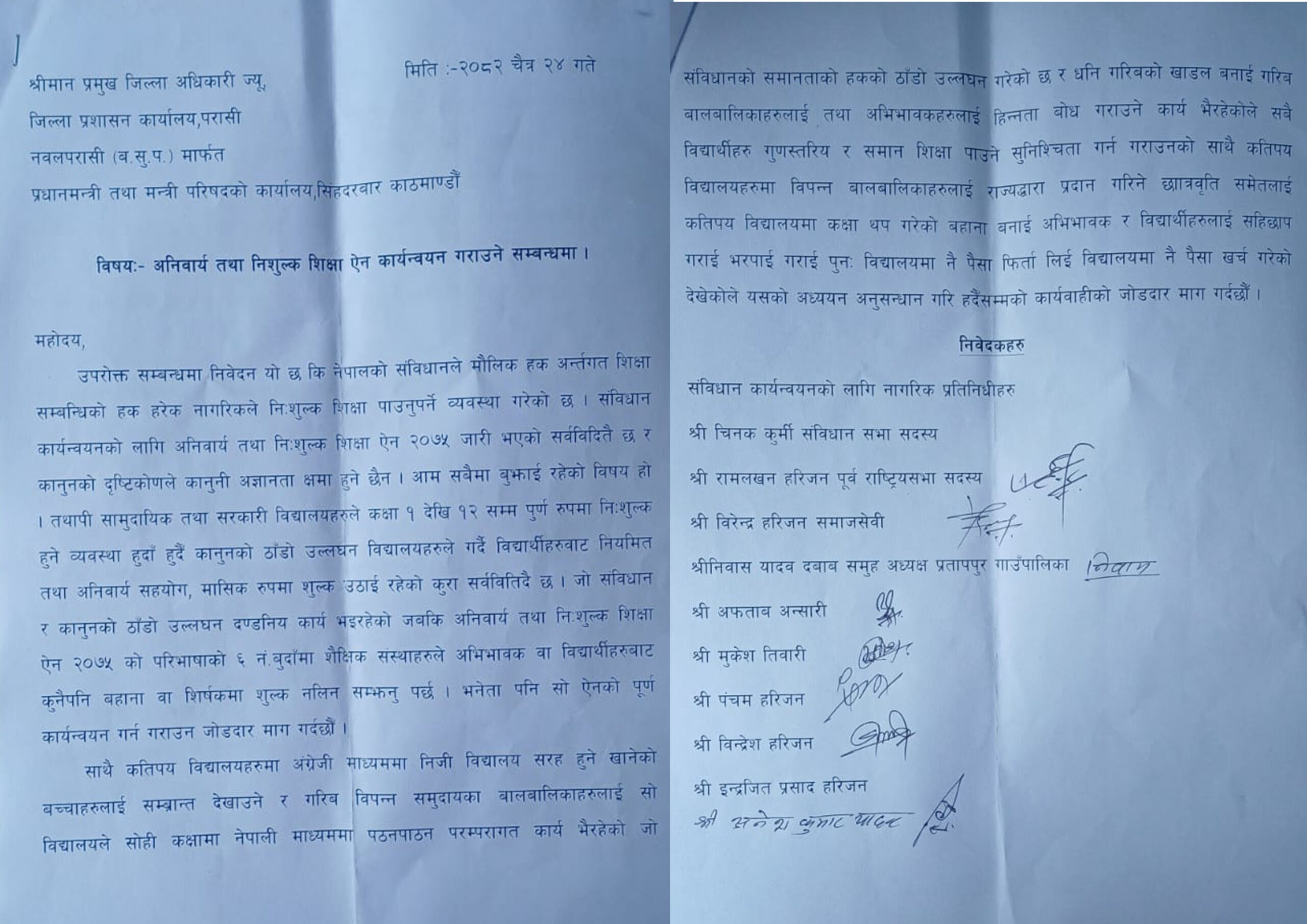 संविधानले सामुदायिक तथा सरकारी विद्यालयहरुमा कक्षा १ देखि १२ सम्म पुर्ण रुपमा निःशुल्क शिक्षा हुने व्यवस्था गरेता पनि विद्यालयहरु कानुनको ठाँडो उलंघन गर्दै विद्यार्थीहरुवाट नियमित तथा अनिवार्य सहयोग, मासिक र परिक्षा शुल्क उठाई रहेको जन गुनासो बढेपछि सरकारको ध्यानाकर्षण गराउनका यो प्रधानमन्त्रीलाई यो ज्ञापन पत्र बुझाइएको पुर्व राष्ट्रिय सभासदस्य हरिजनले जानकारी दिनु भयो ।